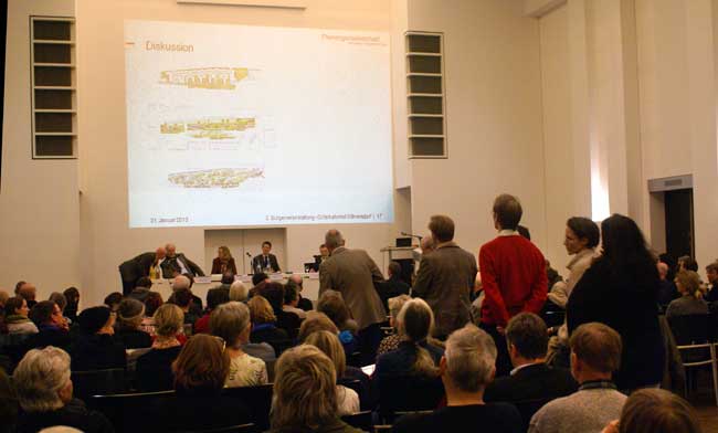 Nach zwei Werkstattgesprächen liegen nun die Karten auf dem Tisch: Drei Architekturbüros haben im Auftrag des vom Investor eingesetzten Moderators Professor Kohlbrenner in jeweils eigenen Entwürfen die Anregungen aus der Bürgerschaft mit dem Beschluss der BVV in Beziehung gebracht, auf diesem Gelände eine weit überwiegende Wohnbebauung in sozial und ökologisch ausgewogener Ausgestaltung vorzusehen.