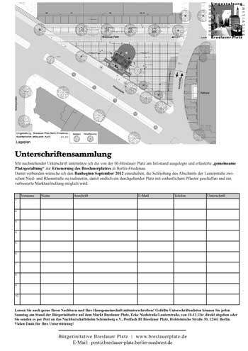 Gefüllte Unterschriftenlisten können Sie jeden Samstag am Stand der Bürgerinitiative auf dem Markt Breslauer Platz, Ecke Niedstraße/Lauterstraße, von 10-13 Uhr direkt abgeben oder Sie senden es per Post an das Nachbarschaftsheim Schöneberg e.V., Postfach BI Breslauer Platz, Holsteinische Straße 30, 12161 Berlin.