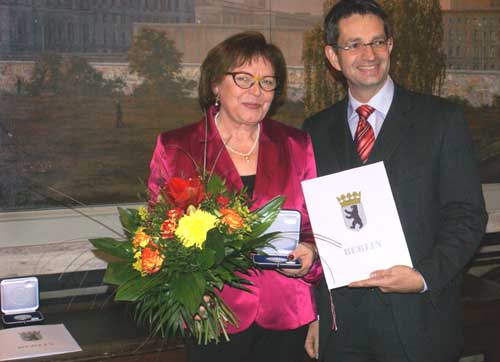 Der Bezirk Tempelhof-Schöneberg ehrte auch dieses Jahr wieder das herausragende freiwillige Engagement von Bürgerinnen und Bürger mit der Verleihung von Verdienstmedaillen. Unter anderen wurde auch Magrit Knapp ausgezeichnet. Frau Knapp war schon während ihres Berufslebens gewerkschaftlich engagiert. Die Pensionierung bot dann Freiraum für weiteres freiwilliges Engagement. In ihrem Wohnkiez in Friedenau wurde sie aktiv und initiierte bzw. wirkte an zahlreichen Projekten mit wie „Friedenau leuchtet“, die „Engelmärkte“ auf dem Breslauer Platz, das „Friedenau-Netzwerk“, „Berlin unsere saubere Stadt – Mach mit“, um nur einige zu nennen. Dieses herausragende und nachhaltige bürgerschaftliche Engagement für die Allgemeinheit wurde im Rathaus Schöneberg mit der Verdienstmedaille des Bezirks gewürdigt. Die Laudatio sprach Bezirksstadtrat Oliver Schworck. Auch in die Arbeit der Bürgerinitiative Breslauer Platz bringt sich Magrit Knapp ein und hat viele Mitglieder davon überzeugen können, aktiv ihre Projekte, wie beíspielsweise die Bepflanzung unter der Bürgerlinde, das Schmücken des Weihnachtsbaumes oder die Putzaktionen auf dem Breslauer Platz zu unterstützen. Wir gratulieren Magrit Knapp zu dieser Würdigung ihres bürgerschaftlichen Engagements.