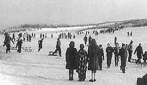 Zuerst die lange, graue Wollunterhose von meinem Vater, die mir viel zu groß war. Dazu ein langärmeliges Unterhemd mit Knöpfen. Über die Füße zwei Paar Wollsocken, die schon etliche Male gestopft waren. Der braunen Trainingshose mit den Flicken an den Knien folgte das Flanellhemd, an dem schon seit Wochen der oberste Knopf fehlte. Nun kamen die ungefütterten Lederstiefel dran, die mir fast zu klein waren. Zuletzt der Anorak und, damit auch der Kopf warm bleibt, die ungeliebte Schirmmütze mit den Ohrenklappen, mit der mich die anderen immer veräppelten. An den kratzenden Schal hatte ich mich schon im laufe der Jahre gewöhnt. Das ich mich letztendlich überhaupt noch bewegen konnte, grenzte immer wieder an ein Wunder. Mit meinem neuen Schlitten auf dem Rücken, lief ich hinüber zu meinem Freund, der auf der gegenüberliegenden Straßenseite wohnte. Vor Mäckis Haustür angekommen, pfiff ich kurz, und gleich darauf trat er ebenso vermummt wie ich mit seinem Schlitten aus der Haustür. Am Kottesteig trafen wir auf die anderen Freunde, und gemeinsam machten wir uns auf den Weg zum Insulaner. Unterwegs amüsierten wir uns köstlich über die verschiedenen Arten von Schlitten, die manche Leute hinter sich herzogen .Da waren schon komische Geräte dabei. Einer hatte eine "Eisenente", ein Rohrgestell mit einer blauen Holzsitzfläche, die einer acht ähnelte. Andere besaßen noch die spitz zulaufenden Schlitten mit den scharfkantigen Kufen, wo man sich immer an den hinteren Holzleisten stieß. Meine Freunde und ich hatten Schlitten der Marke "DAVOS" mit abgerundeten Kufenenden. Diese Schlitten waren stabil und konnten so manchen Sturz standhalten. Als wir das neue Sommerbad am Insulaner erreichten, konnte ich