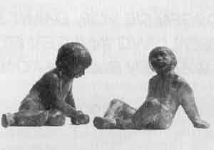 Auch ein Aufruf des Steglitzer Lokal-Anzeigers blieb ohne Erfolg. Zufällig fand sich in einem Familienalbum ein frühes Foto, das einen Sechsjährigen vor einem der Figurensockel zeigt. Später konnte auch die andere Figur einem bereitgestellten Katalog fabrikmäßig hergestellter Bildwerke entnommen werden. Während der Modellarbeiten nahm ein Mitarbeiter des Arbeitskreises den vom Bezirksamt erwünschten Kontakt zu Frau Stiller auf. Bei den Atelierbesuchen in ihrem Haus in der Frobenstraße konnte man in der kleinen Galerie einen großen Teil ihres Lebenswerks betrachten sowie auch das Entstehen der beiden Figurengruppen verfolgen. Ein heitere Episode soll nicht unerwähnt bleiben, denn es gab bei der Figur des Mädchens einen Streit, wie weit schon weibliche Formen erkennbar sein sollten- das Argument des Kindlichen siegte!